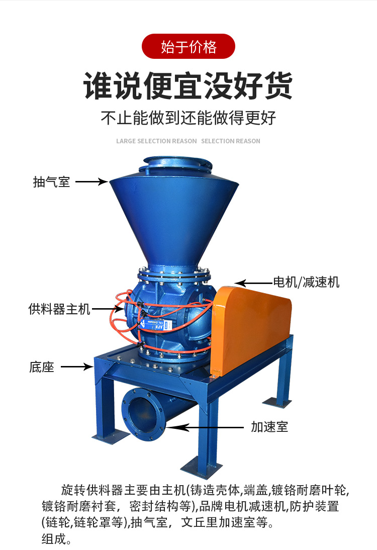 The function of the rotating feeder acceleration chamber: When the feeding port of the feeder supplies powder and granular materials to the conveying pipe, it accelerates the conveying without causing significant pressure loss.